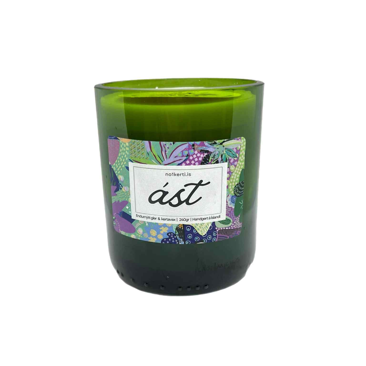 Kertið er handgert úr endurnýttu kertavaxi og glerið er úr kampavínsflösku sem hefur verið vandlega skorin og slípuð til að mynda mjúkar, fallegar línur.