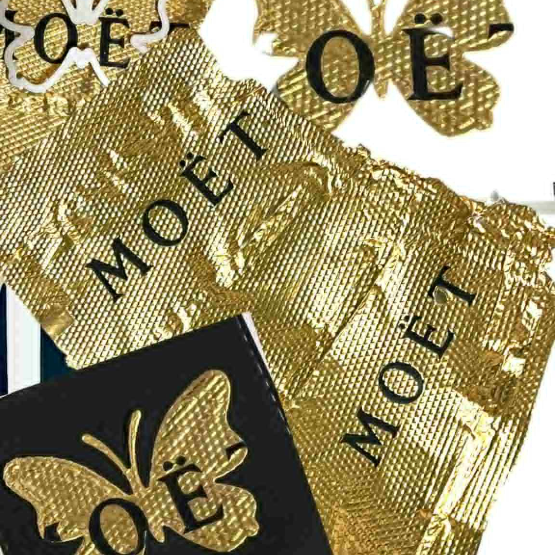 Álumbúðir af kampavínsflöskum fá nýtt líf sem glitrandi skraut á kortinu.
