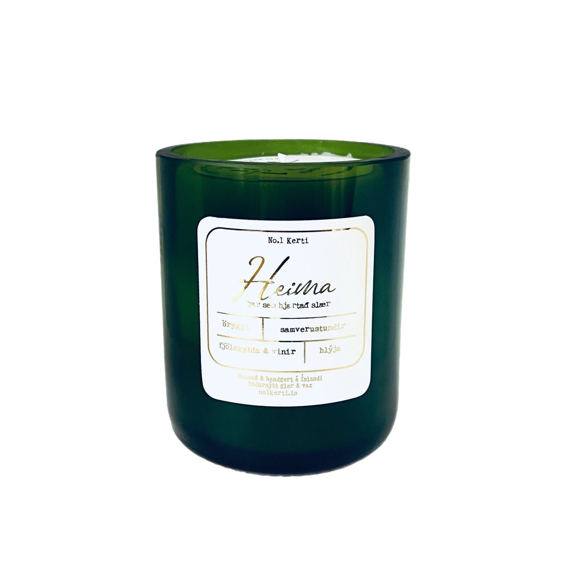 Heimakerti er notalegt fyrir heimilið og tilvalin gjöf fyrir hvaða tilfefni sem er. Það stendur á kertinu: Heima er þar sem hjartað slær og orðin öryggi, samverustundir, fjölskylda & vinir og hlýja.