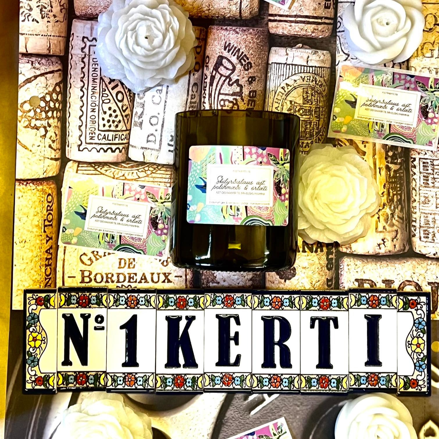Kertið er handgert úr endurnýttu kertavaxi og glerið er botninn af kampavínsflösku sem hefur verið vandlega skorin og slípuð til að mynda mjúkar, fallegar línur.