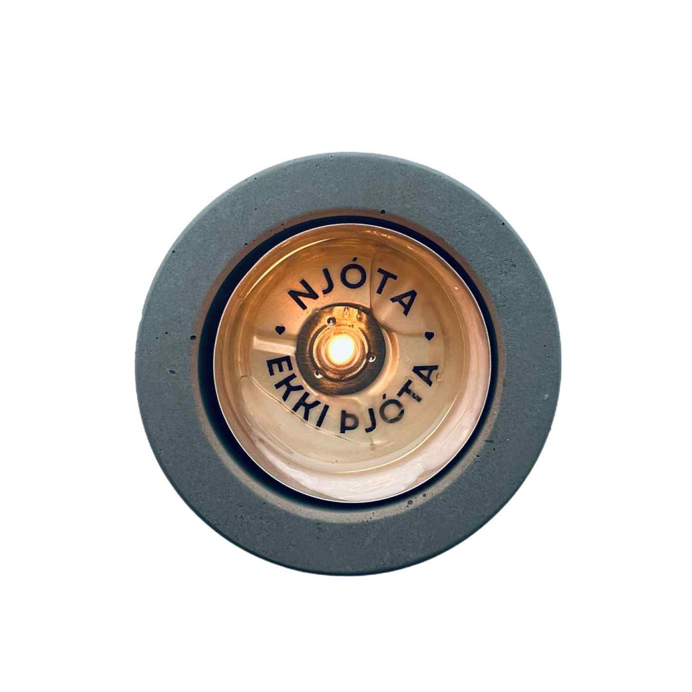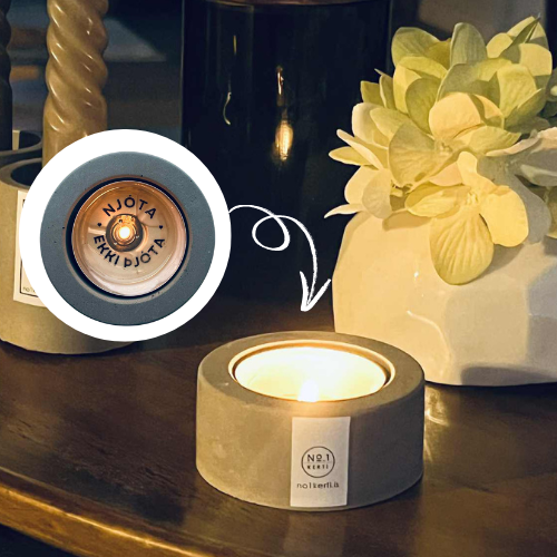 Þetta tekerti kemur í handsteyptum litlum bikar sem gerir hvert eintak einstakt. Þegar kertið hefur brunnið í um það bil 1,5 klukkustund birtast falin skilaboð: „Njóta ekki þjóta“.